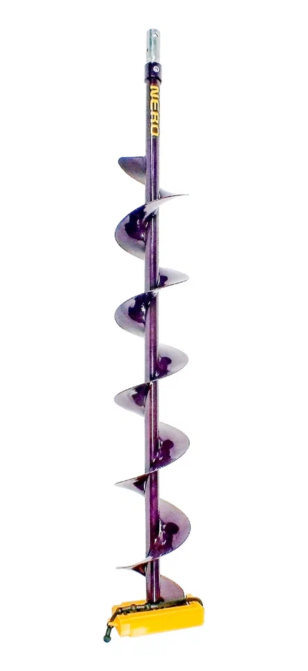 Фото демонстрирует общий дизайн продукции. Ее назначение и основные характеристики указаны в описании товара. Телескопическая модель правого вращения на базе ледобура NERO MINI. Она предназначена для бурения лунок диаметром 130 мм с помощью шуруповерта. В комплекте ножи с винтами крепления, защитный чехол для головки ледобура и адаптер под шуруповерт, причем вместо ручки установлен диск-упор, который «спасет» бур в случае ослабления зажима хвостовика в патроне. Диск-упор травмобезопасен, так как свободно вращается на втулке адаптера. Телескопическая конструкция шнеков позволяет пробурить лед толщиной до 1,58 метра. Фиксация штанги осуществляется болтом с внутренним шестигранником, под «мебельный» ключ. При необходимости длину выдвижной штанги можно увеличить, установив на нее удлинитель NERO 250У или 500У. Межцентровое расстояние крепления ножей 16 мм. При работе с шнеком Nero Mini необходимо использовать шуруповерт с установленной штатной ручкой.